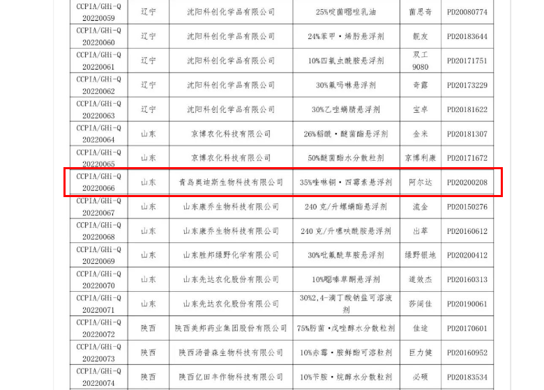 ? ? ? ?以T/CCPIA 170-2021《綠色高質(zhì)量農(nóng)藥產(chǎn)品評價規(guī)范》團體標準為基礎(chǔ),近日中國農(nóng)藥工業(yè)協(xié)會組織了綠色高質(zhì)量農(nóng)藥產(chǎn)品申報工作。經(jīng)協(xié)會形式審查并組織專家綜合審定,由農(nóng)藥生產(chǎn)/經(jīng)營單位自愿申報的69個產(chǎn)品中有45個產(chǎn)品符合T/CCPIA 170-2021標準要求并進入了“第二批綠色高質(zhì)量農(nóng)藥產(chǎn)品公示名單”。奧迪斯專利產(chǎn)品阿爾達??(有效成分:35%喹啉銅·四霉素懸浮劑;登記證號:PD20200208)榮譽上榜。