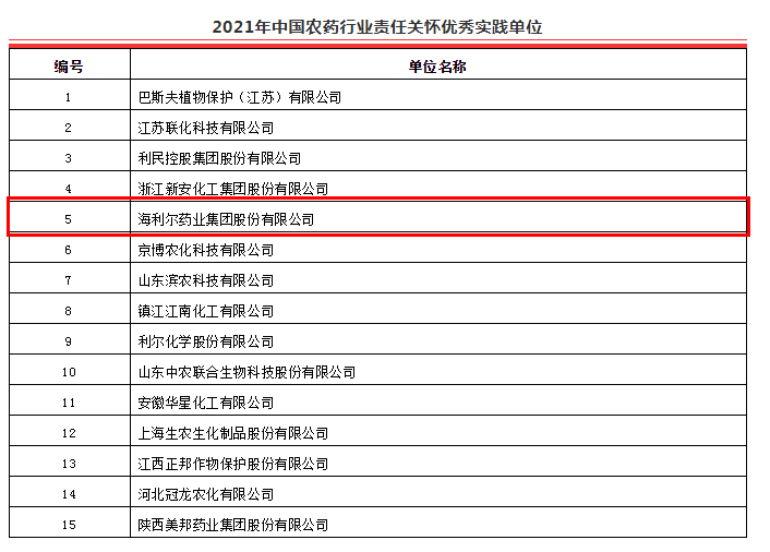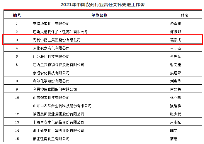 ? ? ? ?砥礪深耕,篤行致遠(yuǎn),中國農(nóng)藥工業(yè)經(jīng)過堅持不懈,開拓進取的奮斗,成為農(nóng)藥生產(chǎn)和出口大國,在全球農(nóng)藥市場上擁有了舉足輕重的地位。在農(nóng)藥行業(yè)展現(xiàn)全新魅力,鼓舞著農(nóng)藥行業(yè)在綠色、低碳、可持續(xù)發(fā)展道路上做深、做實的背景下,《2021中國農(nóng)藥行業(yè)責(zé)任關(guān)懷報告》正式發(fā)布。同時,為鼓勵行業(yè)先進,樹立行業(yè)楷模,中國農(nóng)藥工業(yè)協(xié)會近日分別發(fā)布了15家“2021年中國農(nóng)藥行業(yè)責(zé)任關(guān)懷優(yōu)秀實踐單位”和15位“2021年中國農(nóng)藥行業(yè)責(zé)任關(guān)懷先進工作者”。海利爾藥業(yè)集團與集團葛家成總裁分獲殊榮,榮登榜單。