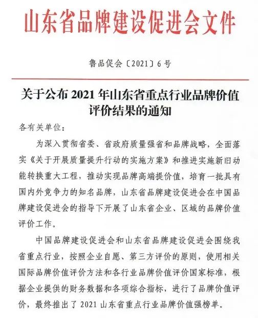 ? ? ? ? 為深入貫徹省委、省政府質(zhì)量強(qiáng)省和品牌戰(zhàn)略,全面落實(shí)《關(guān)于開(kāi)展質(zhì)量提升行動(dòng)的實(shí)施方案》和推進(jìn)實(shí)施新動(dòng)能轉(zhuǎn)換重大工程,推動(dòng)實(shí)現(xiàn)品牌高端提價(jià)值,培育一批具有國(guó)內(nèi)外競(jìng)爭(zhēng)力的知名品牌,山東省品牌建設(shè)促進(jìn)會(huì)在中國(guó)品牌建設(shè)促進(jìn)會(huì)的指導(dǎo)下開(kāi)展了山東省企業(yè)、區(qū)域的品牌價(jià)值評(píng)價(jià)工作。