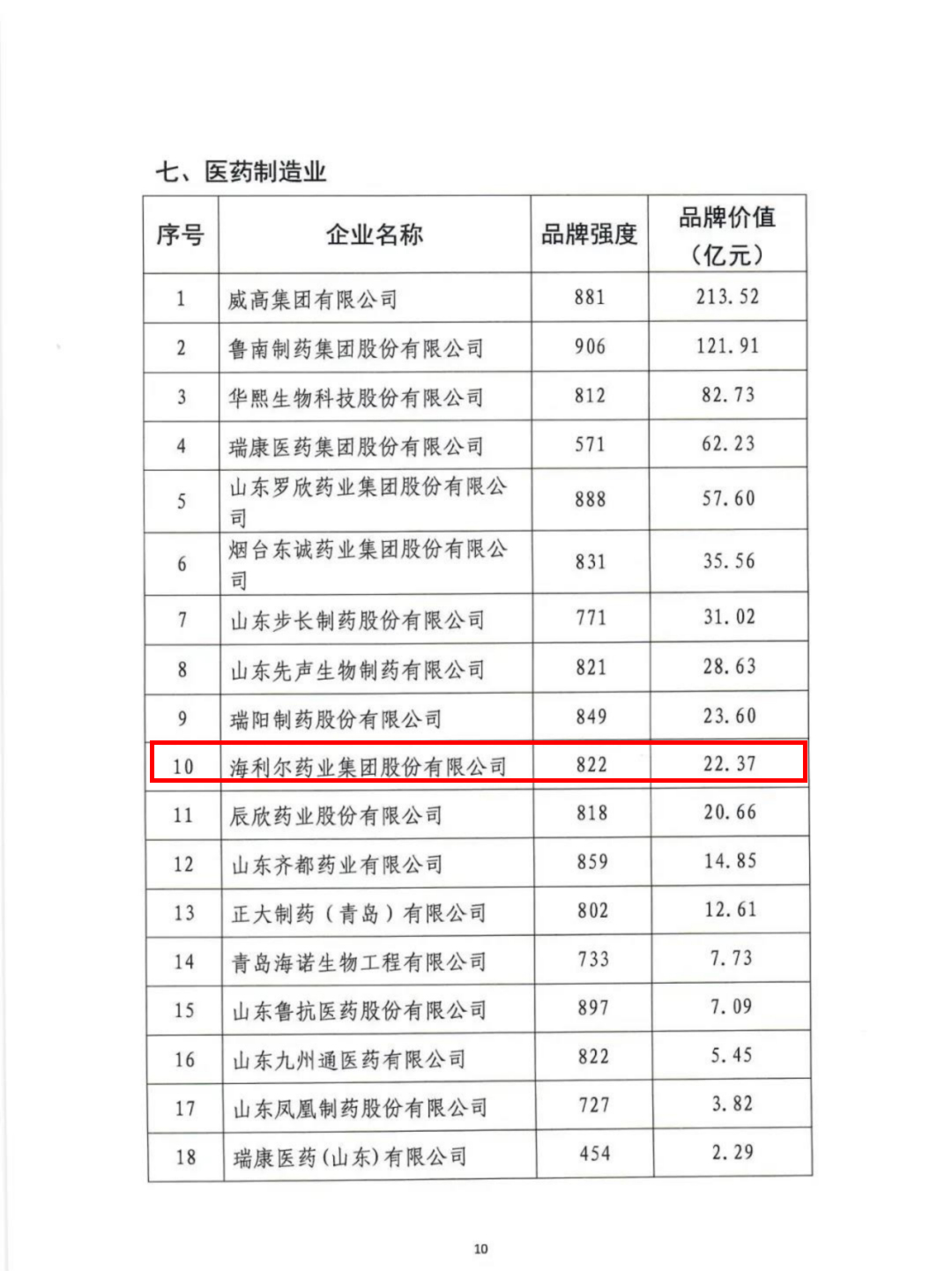 ? ? ? ? 中國(guó)品牌建設(shè)促進(jìn)會(huì)和山東省品牌建設(shè)促進(jìn)會(huì)圍繞我省重點(diǎn)行業(yè),按照企業(yè)自愿、第三方評(píng)價(jià)的原則,使用相關(guān)國(guó)際品牌價(jià)值評(píng)價(jià)方法和各行業(yè)品牌價(jià)值評(píng)價(jià)國(guó)家標(biāo)準(zhǔn),根據(jù)企業(yè)提供的財(cái)務(wù)數(shù)據(jù)和各項(xiàng)綜合指標(biāo),進(jìn)行了品牌價(jià)值評(píng)價(jià),最終推出了2021山東省重點(diǎn)行業(yè)品牌價(jià)值強(qiáng)榜單。海利爾藥業(yè)集團(tuán)股份有限公司以22.37億元品牌價(jià)值入選醫(yī)藥制造行業(yè)榜單第十名!