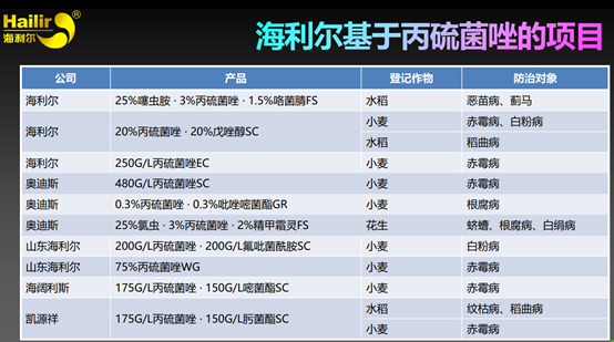 據(jù)葛堯倫董事長介紹,在2020年,海利爾的丙硫菌唑原藥正式投產(chǎn),現(xiàn)產(chǎn)2000噸/年,二期在設計推進 6000噸/年自動化車間。目前海利爾基于丙硫菌唑具體有以下這些: