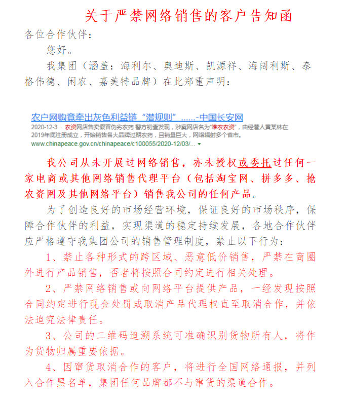 我公司從未開展過網(wǎng)絡(luò)銷售,亦未授權(quán)或委托過任何一家電商或其他網(wǎng)絡(luò)銷售代理平臺(tái)(包括淘寶網(wǎng)、拼多多、搶農(nóng)資網(wǎng)及其他網(wǎng)絡(luò)平臺(tái))銷售我公司的任何產(chǎn)品。
