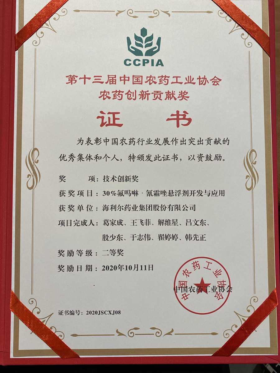 ????? ?10月11日,第十三屆中國農藥工業(yè)協(xié)會農藥創(chuàng)新貢獻獎名單揭曉,海利爾藥業(yè)集團股份有限公司榮獲技術創(chuàng)新獎二等獎。