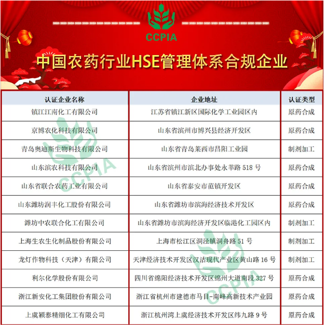 ???????10月11日,“中國農藥行業(yè)HSE管理體系合規(guī)企業(yè)”名單發(fā)布,海利爾藥業(yè)集團旗下子公司青島奧迪斯生物科技有限公司榜上有名。