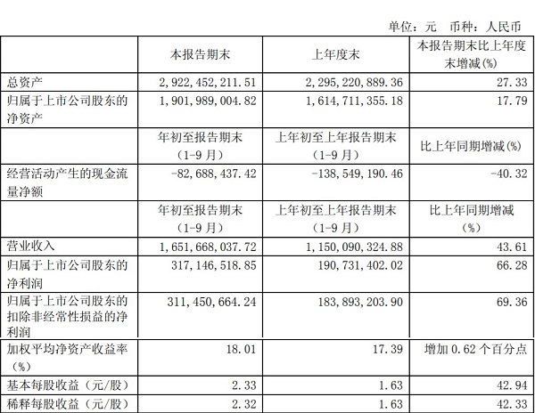 海利爾藥業(yè)集團(tuán)股份有限公司(以下簡稱“海利爾”)近日發(fā)布了2018年第三季度報(bào)告,報(bào)告顯示,公司前三季度營業(yè)收入1,651,668,037.72元,同比增長43.61%,前三季度歸屬于上市公司股東的凈利潤317,146,518.85元,同比增長66.28%。
