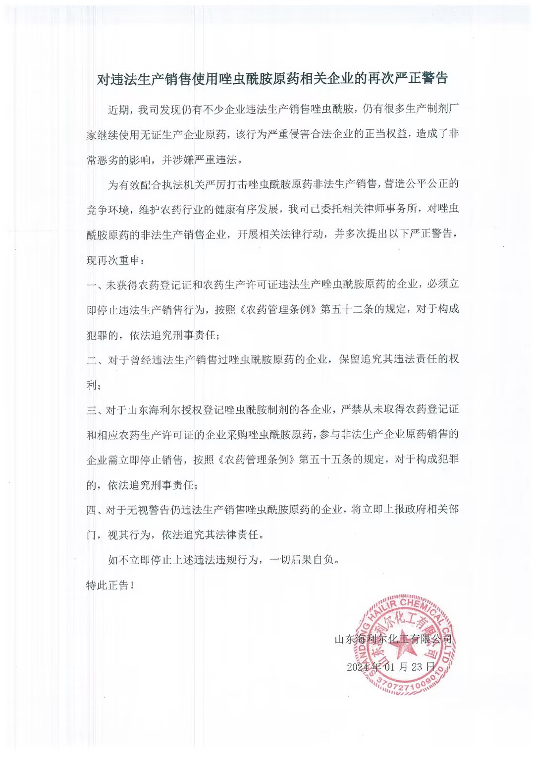 ? ? ? ?為有效配合執(zhí)法機(jī)關(guān)嚴(yán)厲打擊唑蟲酰胺原藥非法生產(chǎn)銷售,營(yíng)造公平公正的競(jìng)爭(zhēng)環(huán)境,維護(hù)農(nóng)藥行業(yè)的健康有序發(fā)展,我司已委托相關(guān)律師事務(wù)所,對(duì)唑蟲酰胺原藥的非法生產(chǎn)銷售企業(yè),開展相關(guān)法律行動(dòng),并多次提出以下嚴(yán)正警告,現(xiàn)再次重申: