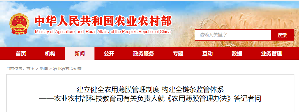 近日,農(nóng)業(yè)農(nóng)村部、工業(yè)和信息化部、生態(tài)環(huán)境部、市場(chǎng)監(jiān)管總局聯(lián)合印發(fā)了《農(nóng)用薄膜管理辦法》。為全面深入了解《辦法》出臺(tái)背景、主要內(nèi)容及特點(diǎn),農(nóng)業(yè)農(nóng)村部科技教育司有關(guān)負(fù)責(zé)人接受了采訪。