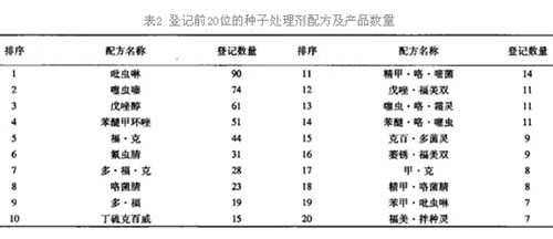 ??? 截至2017年底,取得登記的種子處理劑共涉及45種有效成分(表1),前5位有效成分為福美雙、克百威、吡蟲啉、噻蟲嗉、戊唑醇,含有這5種有效成分的產(chǎn)品總和占登記總量的50%以上;共有登記配方164個(包括38種單劑產(chǎn)品),登記數(shù)量前20位的配方(表2)。