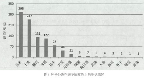 ??? 據(jù)統(tǒng)計(jì),我國現(xiàn)有的種子處理劑共在15種作物上取得登記,主要集中在玉米、小麥、棉花、水稻、花生、大豆(圖3),共涉及防治對象40多種,主要是蚜蟲、地下害蟲、土傳、種傳病害。苗期病害等。