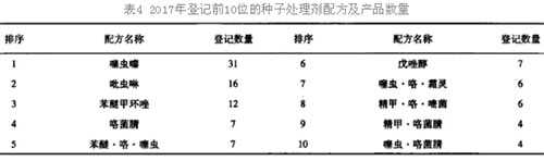 ??? 2017年新增登記的種子處理劑共涉及27種有效成分(表3),唑環(huán)菌胺、氯蟲苯甲酰胺等一批新品種已加入到種子處理產(chǎn)品的行列,產(chǎn)品結(jié)構(gòu)有了一定程度的優(yōu)化;共有登記配方50個(包括12種單劑產(chǎn)品),前10位的配方及其具體登記數(shù)量(表4),混配產(chǎn)品所占比重明顯增加;此外,毒性級別較高的農(nóng)藥品種已基本退出了舞臺。