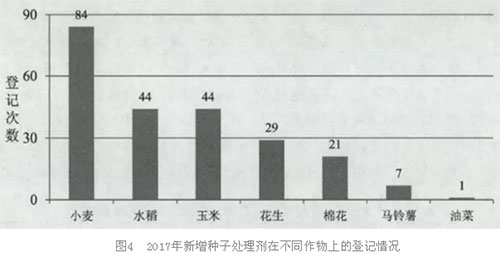 ??? 2017年新增登記的種子處理劑所涵蓋的作物種類共有8種,作物名稱及登記次數(shù)(圖4),主要集中于小麥、水稻、玉米這些大宗糧食作物上,占比約74.8%。與總的登記情況相比,小麥、水稻上登記的種子處理劑呈上升趨勢,玉米、棉花的登記數(shù)量正逐漸下降,與我國種植業(yè)結(jié)構(gòu)調(diào)整密切相關(guān)。