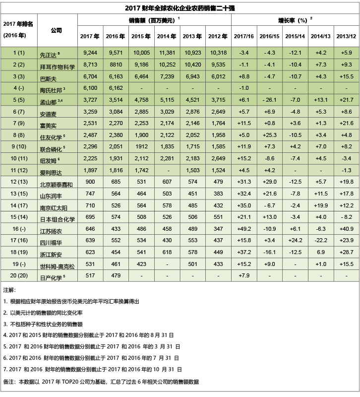 位居該榜單第16位的江蘇揚(yáng)農(nóng),其美元計(jì)銷售額大幅飆升49.2%(2016:-10.9%), 同時(shí)也是該榜單增幅最高的公司。據(jù)悉,2017年,揚(yáng)農(nóng)化工核心客戶全部實(shí)現(xiàn)業(yè)績(jī)?cè)鲩L(zhǎng),其子公司江蘇優(yōu)嘉植物保護(hù)有限公司產(chǎn)品的登記和市場(chǎng)布局全面展開,麥草畏成為揚(yáng)農(nóng)化工第2個(gè)銷量過萬噸的品種,菊酯類產(chǎn)品和麥草畏居于行業(yè)領(lǐng)先地位,進(jìn)而推動(dòng)揚(yáng)農(nóng)化工銷售和利潤(rùn)均創(chuàng)歷史新高。