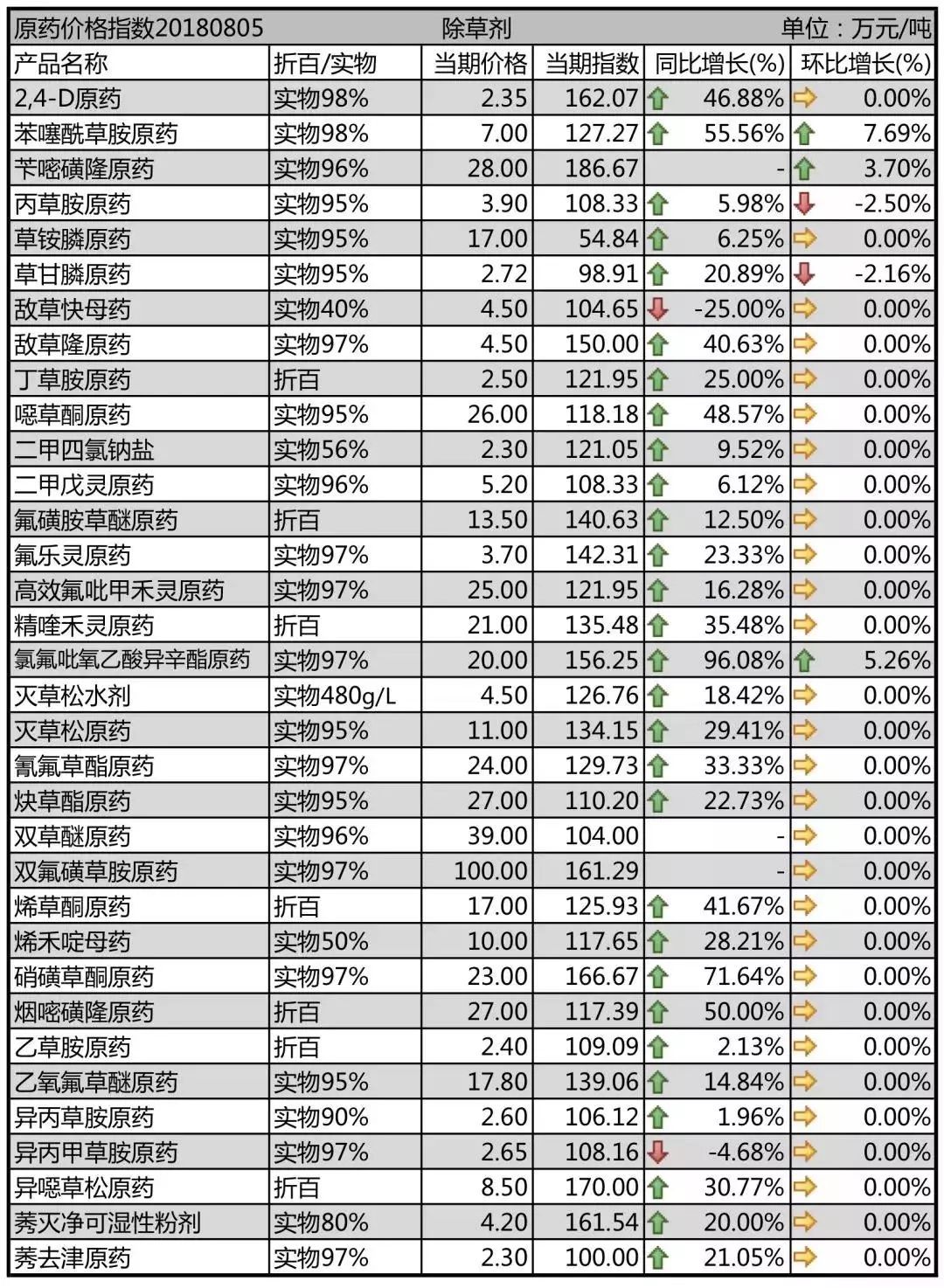 環(huán)比上周,苯噻酰草胺原藥、芐嘧磺隆原藥、氯氟吡氧乙酸異辛酯原藥等上漲,丙草胺原藥、草甘膦原藥下滑,其余除草劑品種穩(wěn)定為主。
