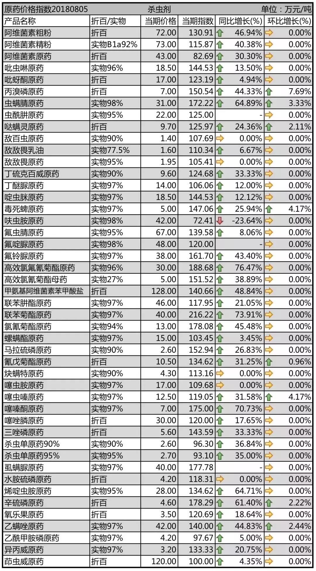 環(huán)比上周,丙溴磷原藥、蟲螨腈原藥、噠螨靈原藥、毒死蜱原藥、氰戊菊酯原藥、噻蟲嗪原藥、辛硫磷原藥、乙螨唑原藥等上漲,其余殺蟲劑品種穩(wěn)定為主。