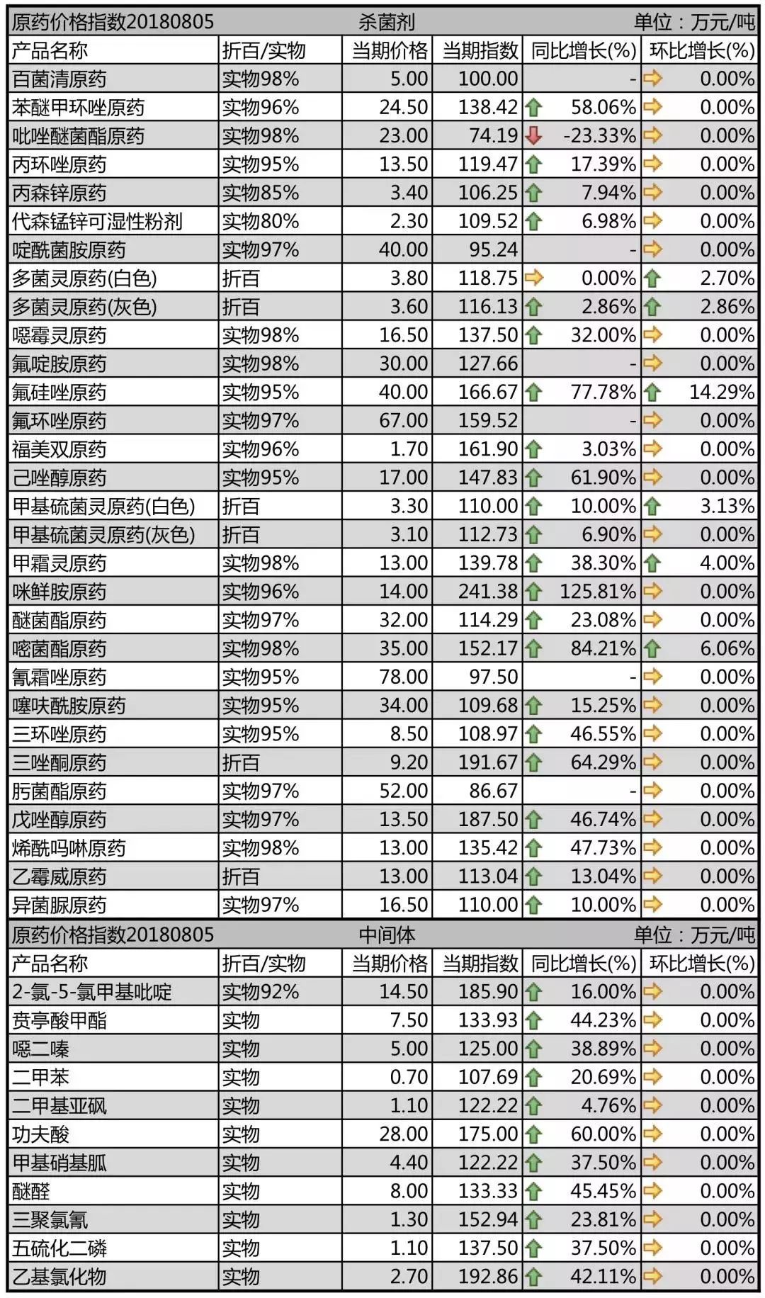 環(huán)比上周,多菌靈原藥、氟硅唑原藥、甲基硫菌靈原藥、甲霜靈原藥、嘧菌酯原藥等品種上漲,其余殺菌劑和中間體品種穩(wěn)定為主。