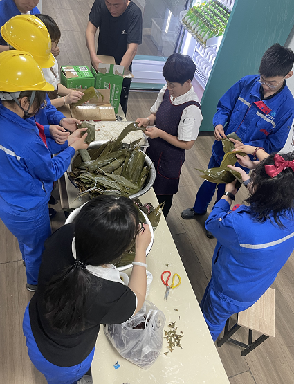 ? ? ? ?為了更好實現(xiàn)家文化與節(jié)日文化的互動相融,人力行政處提前購置糯米、蜜棗、豆沙、蛋黃、五花肉、粽葉等包粽子的材料,并于節(jié)前一天做好了準備工作。糯米、粽葉等必備材料被整齊的擺上桌,大家一起齊動手相互交流學習包粽子的技巧,大家還一起分享五彩繩相互給彼此系上,整個活動現(xiàn)場歡聲笑語、其樂融融。