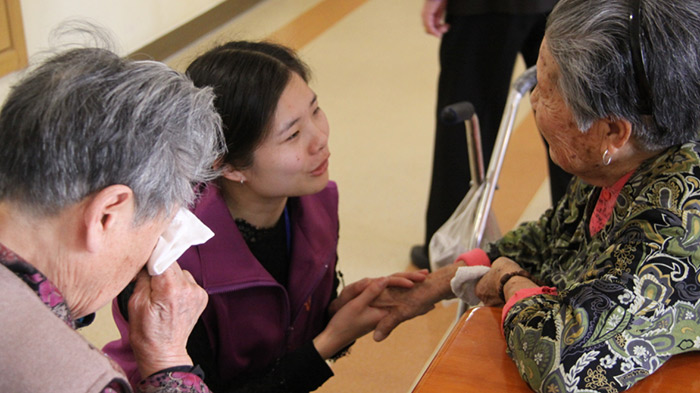 儀式結(jié)束后便開始義工活動。在工作人員的帶領(lǐng)下,志愿者們來到了老年人活動室。一到那里他們便集體向在場的老人們鞠躬并問好:“各位爺爺、奶奶們,我們是海利爾藥業(yè)集團的員工,今天非常有幸能來這里看望各位長輩,您有需要就跟我們講,能幫助你們是我們最大的榮幸。”爺爺奶奶們拉著志愿者們的手,仿佛看到了自己的家人那么親切。